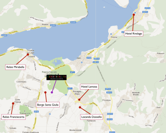 Di seguito elencati troverete alcuni Hotel suggeriti a chi gradisse approfittarne e pernottare e/o trascorrere il weekend in Franciacorta (clicca la mappa per ingrandire):